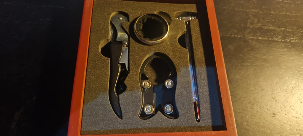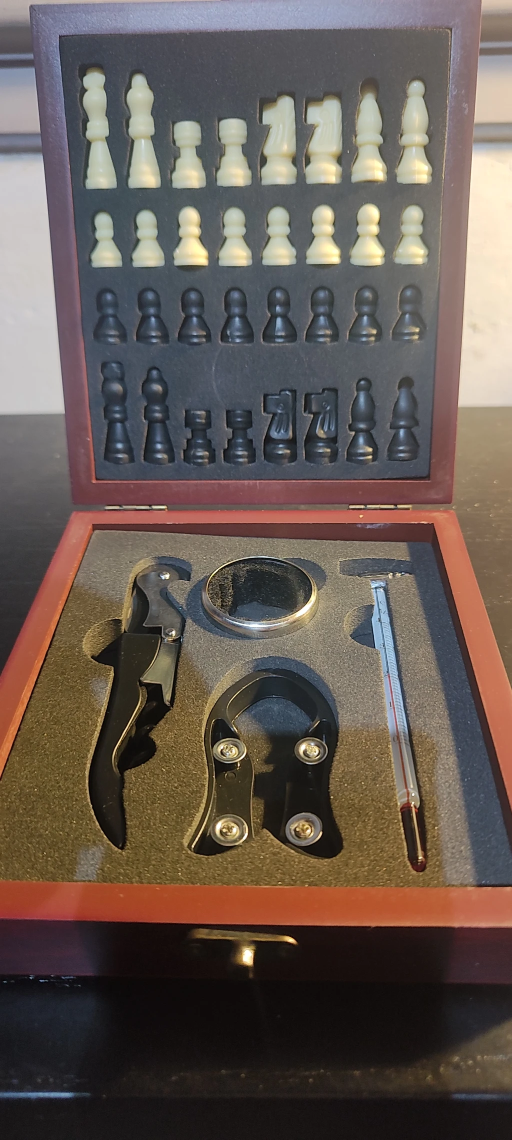 Box Set Ajedrez Blancas/Negras con Desatapador sacacorcho con termometro , para vinos